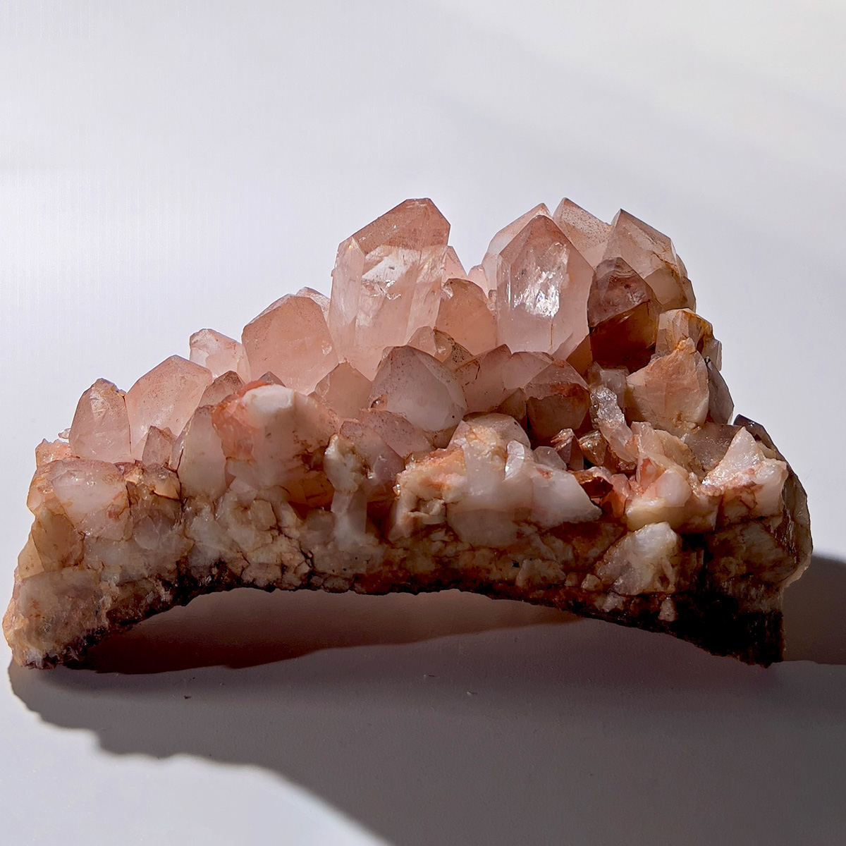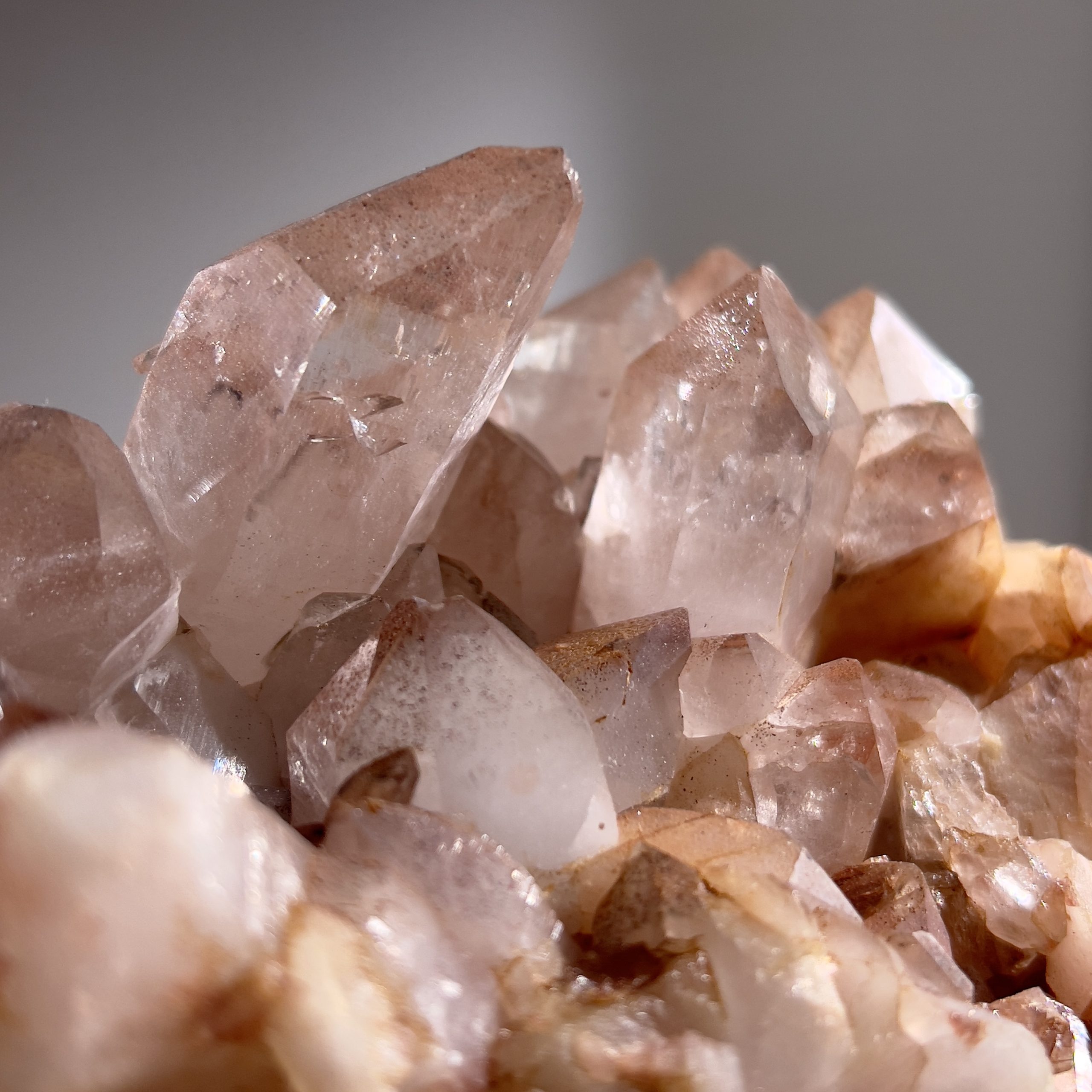 不是所有從同樣產區產出的三摩地水晶都是粉色的,也有看過屬於白水晶的樣子,畢竟粉色多是因為含鐵一類礦物質所致,也會有多寡一類的差異,這顆算是一整批中,挑出來比較粉色並同時強烈有感的,而且是幾乎全礦體都有明確的粉色的三摩地水晶,許多晶體的尖端都帶有共生,更加強了它的特質。