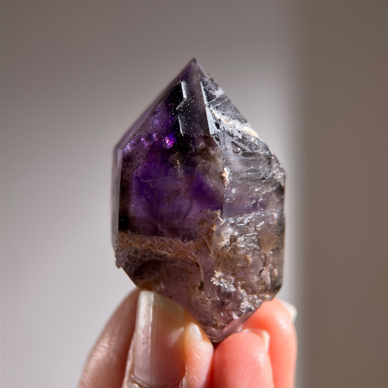 布蘭登堡幻影紫水晶(Brandberg Amethyst Phantom Quartz ),幻影原是指晶體內部有類似金字塔形的區域,眼睛看過去像是倒三角的呈現,不過布蘭登堡的水晶只要內部有一抹紫或說有紫色的區域,有些人都會使用幻影紫這個名稱,anyway就是布蘭登堡的有紫色塊的水晶,這種紫色,有的是像紫羅蘭的紫,有的是煙紫色,變化也很多元,很多幻影也會隨著不同角度的觀賞產生不同視覺變化,畢竟名為幻影,某種程度就是在表達這種現象,通常幻影水晶被歸類為一種異象水晶,它的形成可能跟內包裹的礦物或生長速度等等有關。