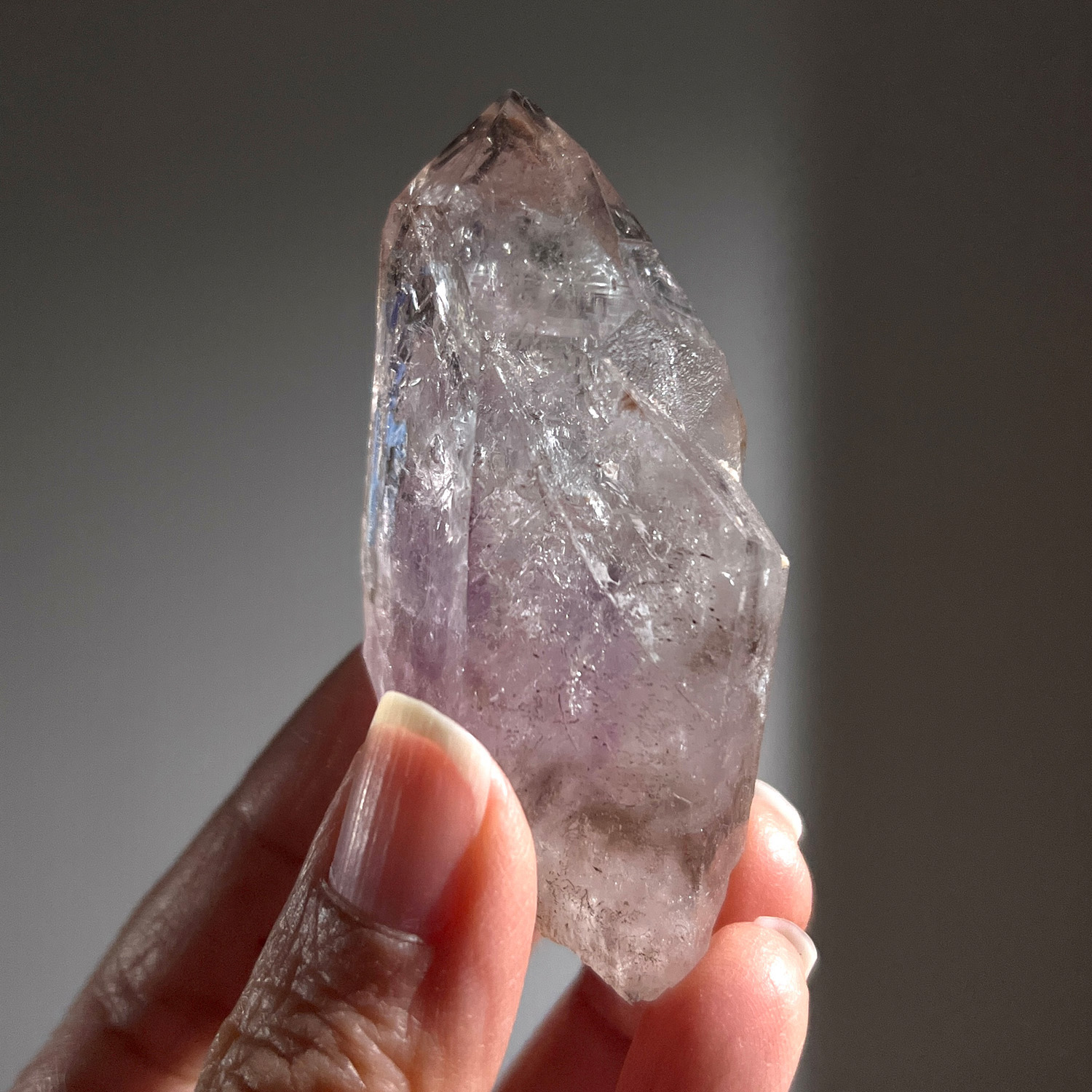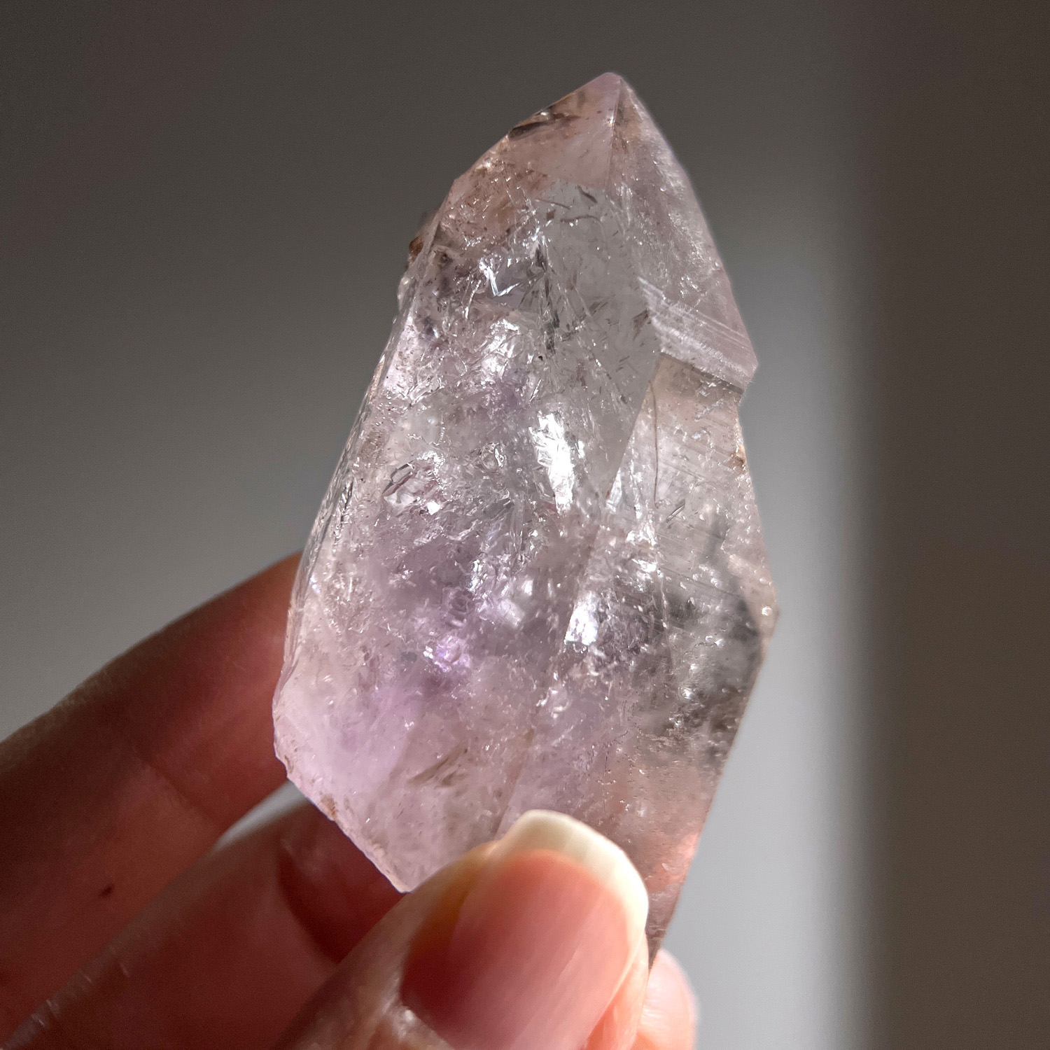 布蘭登堡幻影紫水晶(Brandberg Amethyst Phantom Quartz ),幻影原是指晶體內部有類似金字塔形的區域,眼睛看過去像是倒三角的呈現,不過布蘭登堡的水晶只要內部有一抹紫或說有紫色的區域,有些人都會使用幻影紫這個名稱,anyway就是布蘭登堡的有紫色塊的水晶,這種紫色,有的是像紫羅蘭的紫,有的是煙紫色,變化也很多元,很多幻影也會隨著不同角度的觀賞產生不同視覺變化,畢竟名為幻影,某種程度就是在表達這種現象,通常幻影水晶被歸類為一種異象水晶,它的形成可能跟內包裹的礦物或生長速度等等有關。