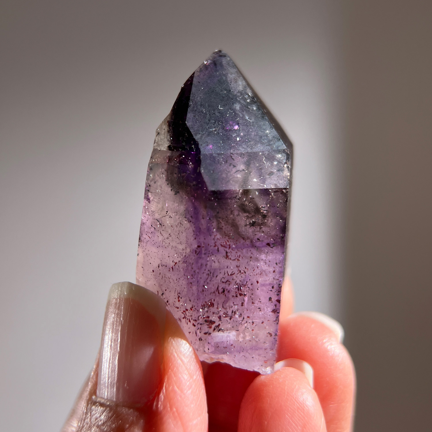 納米比亞紫色系列的水晶市價通常更高,除了幻影紫,再來就是葡萄紫系列。這顆可能在市場上會被稱作納米比亞超七水晶,因為它具有豐富的內包裹,特別是(纖/)赤鐵礦一類被稱作金草莓的紅色片狀物,閃閃亮亮的內包裹可能是俗稱金髮晶的鈦金類金紅石,但因太細小不是很確定,資訊僅供參考。