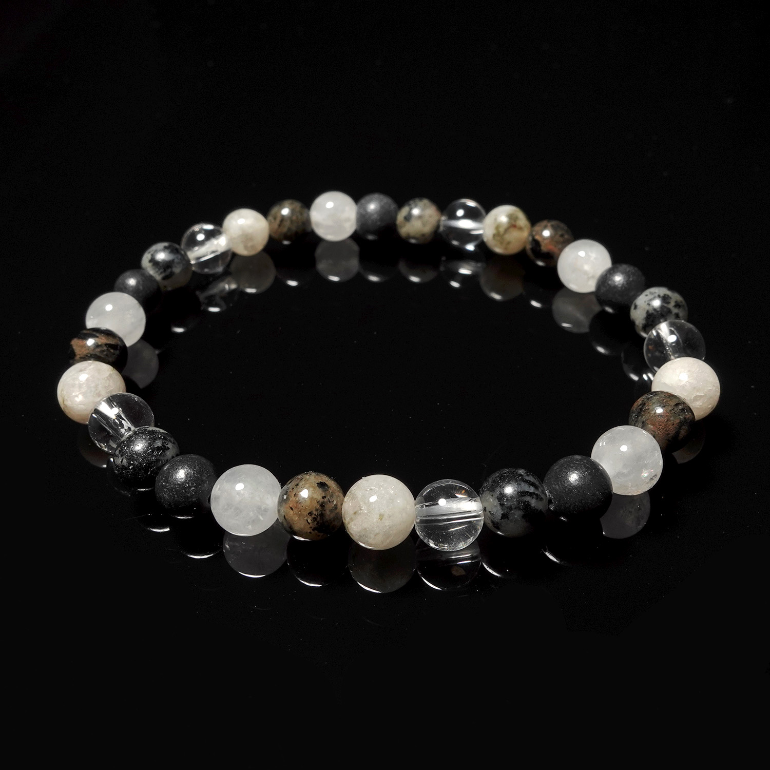 手串的組成包含挪威矽鈹石 (Norwegian Phenacite)、白色阿賽斯特萊、黑色阿賽斯特萊、黑碧璽阿賽斯特萊、Satyaloka Clear阿賽斯特萊以及沙之玫瑰阿賽斯特萊,每一種都為手串帶來獨特的能量共振,創造出更為和諧穩定的效果。