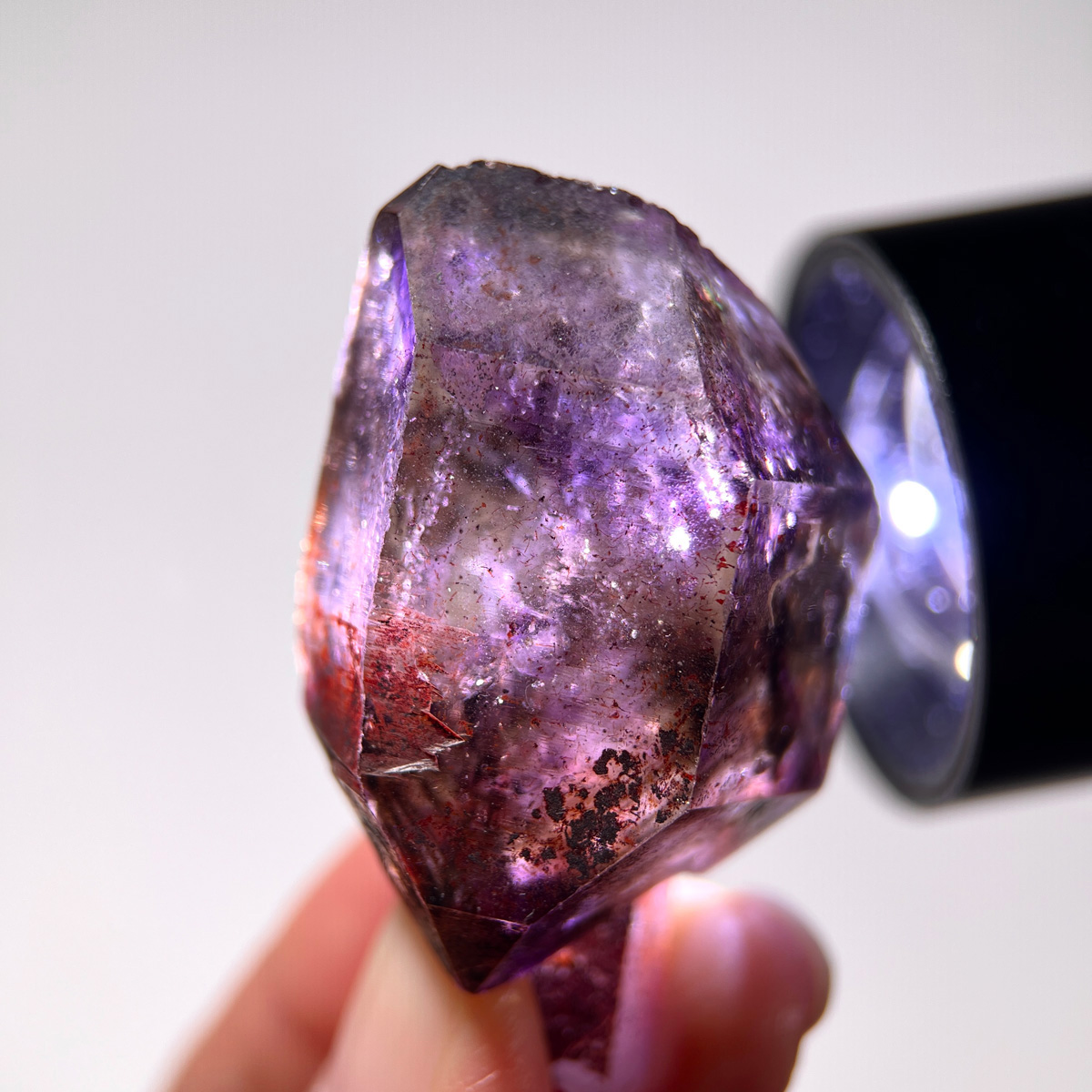 在使用手電筒或光源照射內部,可以看見散射出來的紫色光芒和清晰的內包裹,我建議你一邊轉動它們,一邊看著它們,因為那些散射出來的光芒具有很直接的能量和療癒性,也刺激了眼區的感受。