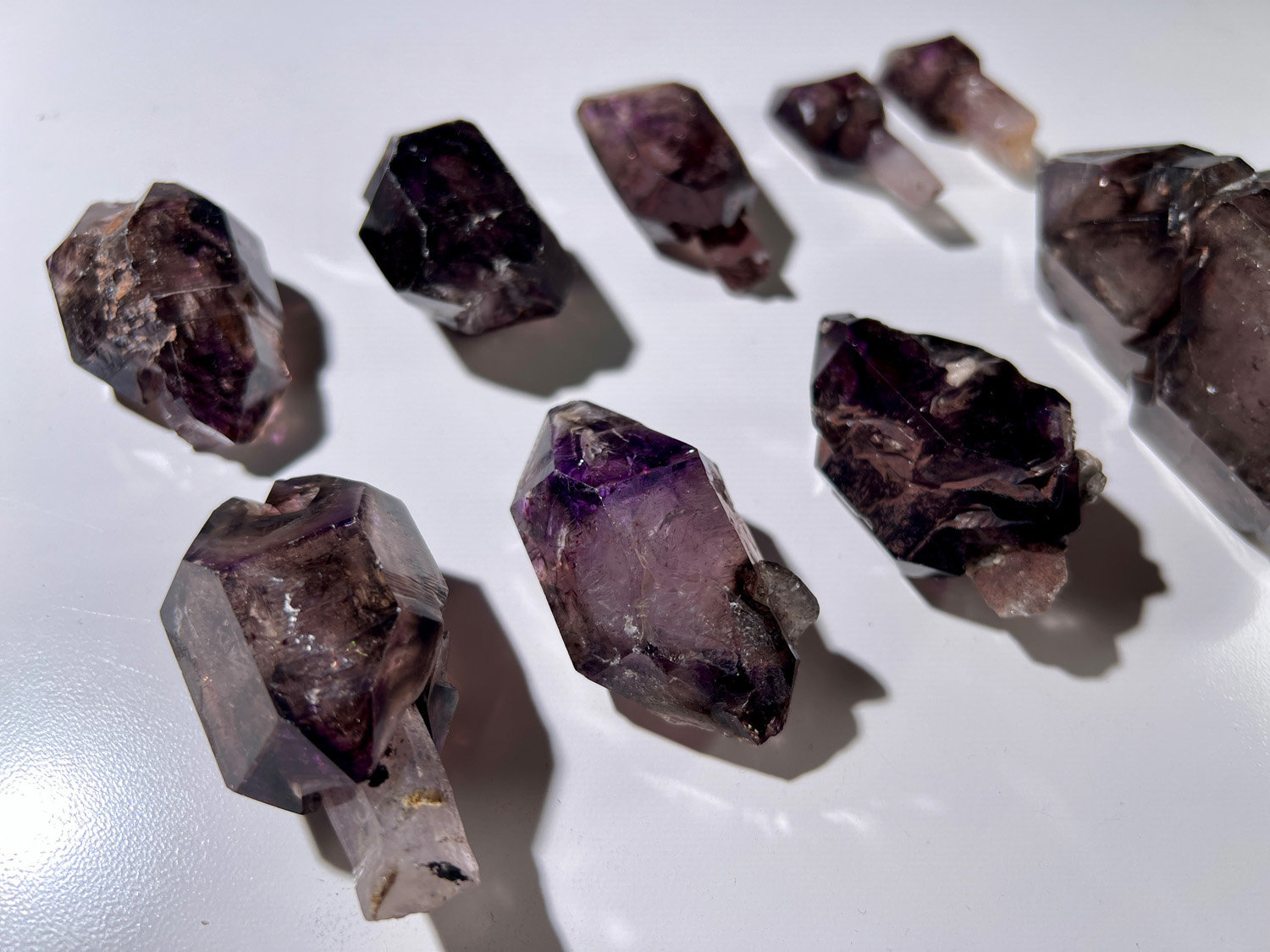 產地:辛巴威。這批幾乎都有內包裹俗稱金草莓的紅色點狀或片狀或條狀共生物質,是一種赤鐵礦或纖鐵礦,也幾乎都有內包裹金色絲線狀-俗稱金髮晶的金紅石,即影片中細閃發光的部分,有些包裹的多有些少點,若有誤判也請見諒。有一些是權杖的型態,有一些有骨幹的型態,有些具有紫幻影,大多具有很好的透亮度,若具透度,通常可以看見裡面有骸骨的結構,是四年多前收藏的小精品們。PS.照片區的第二張會放上燈射的照片,影片也會拍攝,可參考其內包裹物及色彩,但色彩會因燈的色溫與演色性的差異,可能會與你照射出來的不完全相同。