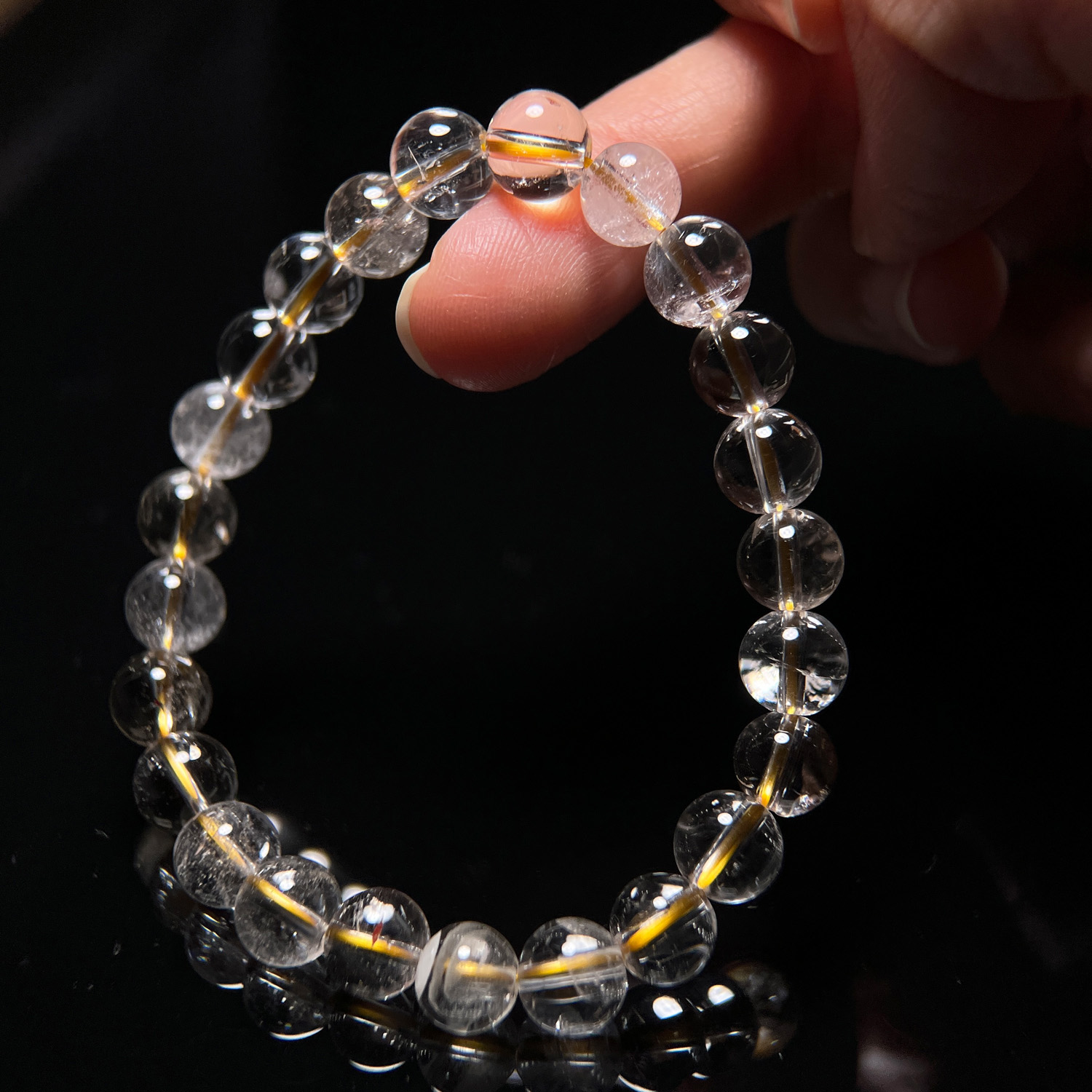 這批是非常淨透並且有特殊內包裹物,大多會有幾顆具有金草莓一類的赤(/纖)鐵礦,或是綠幽靈、黑幽靈,甚至有白霧或是千層影山,有一兩串某一顆有金紅石一類的金髮晶,就不特別標示,請參閱影片,有細節拍攝。