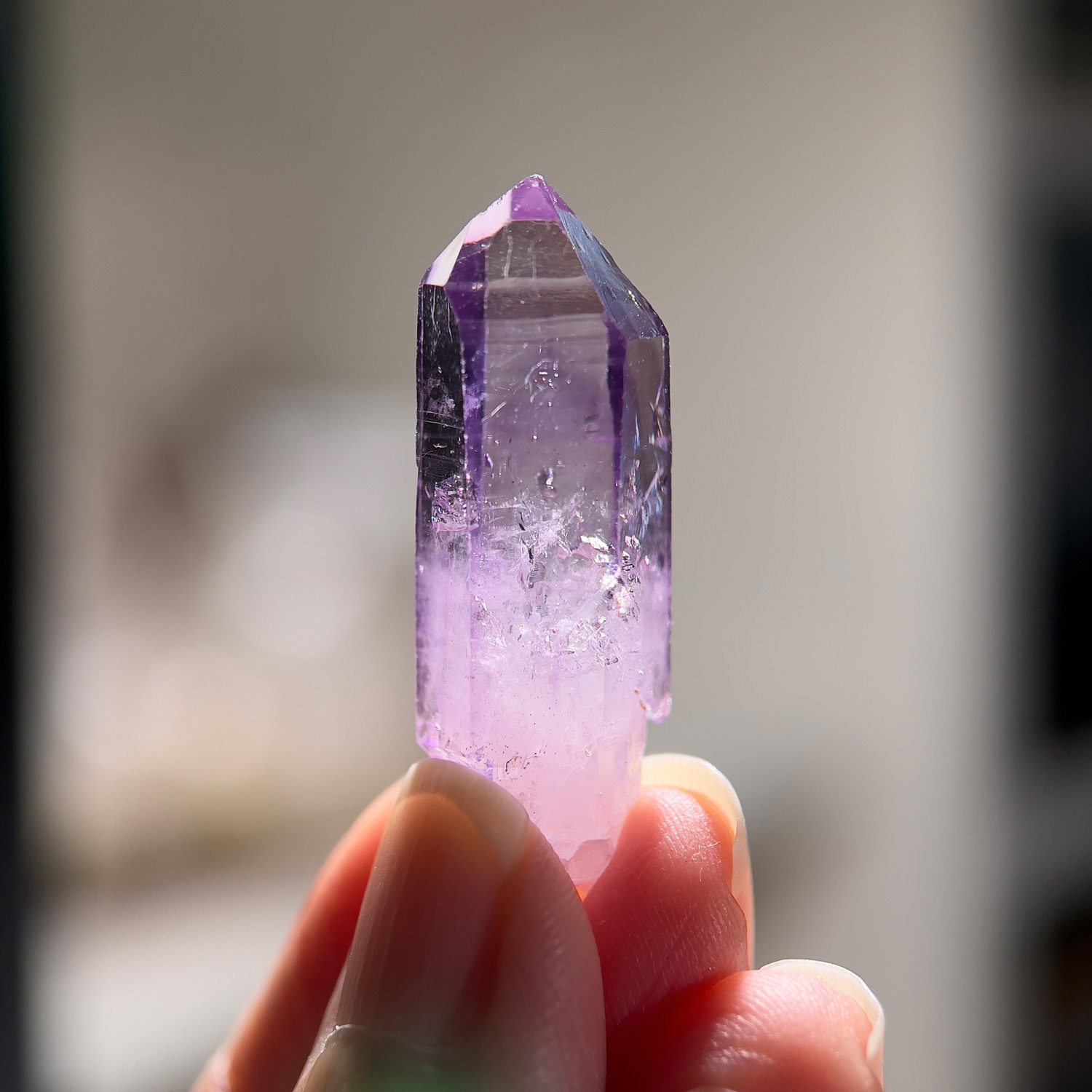 我說我買不起精品一整批,他就低頭一陣子,突然挑出了20幾支,燦爛的笑著說,我幫你從這框特挑出有幻影的,他滿臉得意問我滿意嗎,問我他是不是很會挑,我是覺得這過程很荒唐,但他就這樣用批發的價格給我這20支,但是精品級的批發價也是很高的啦,只是再高也不比納米比亞布蘭登堡幻影紫高,總而言之,我覺得是緣分使然,我就帶走了它們。