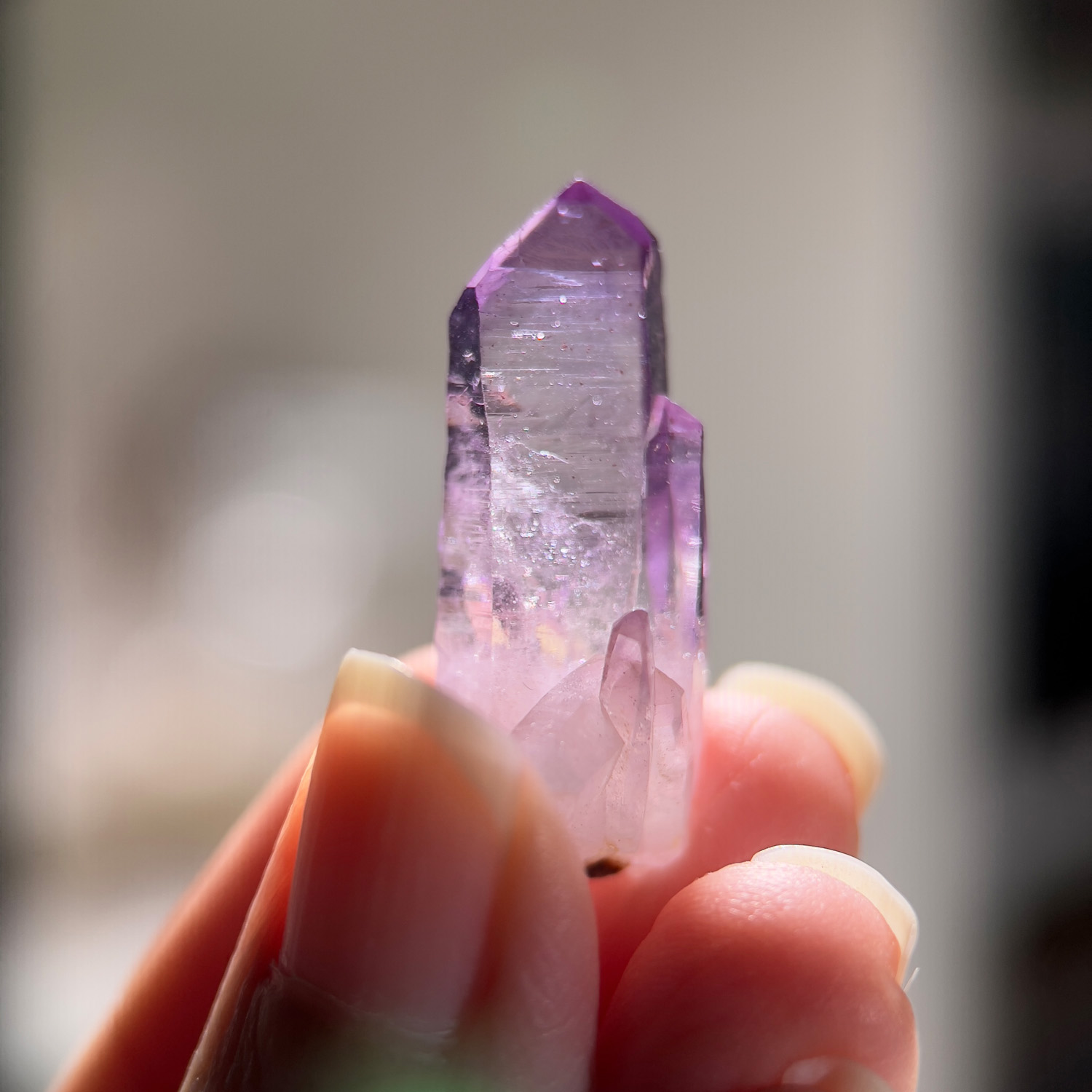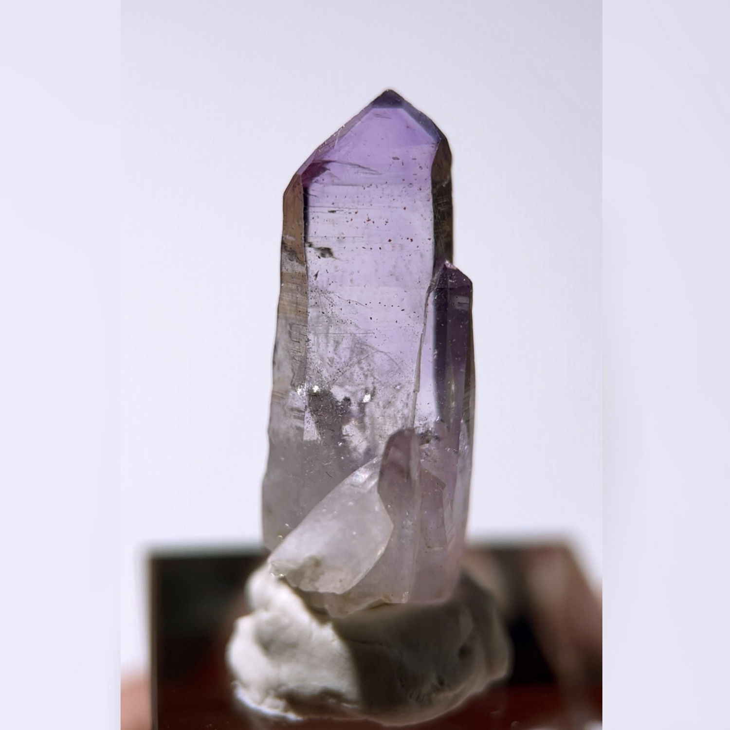 這批克魯茲紫水晶,是一年多前從許多批次的克魯茲紫水晶中,陸續挑選出來一框的精品,我從中帶走20幾支;一般的克魯茲或是淡紫、或是棉體、或是僅有尖頂較紫,下半部偏淡,而這批具有色澤飽滿的紫羅蘭色、晶體高透亮並有金字塔幻影,部分有赤鐵礦共生,是較稀少的精品級克魯茲紫水晶。